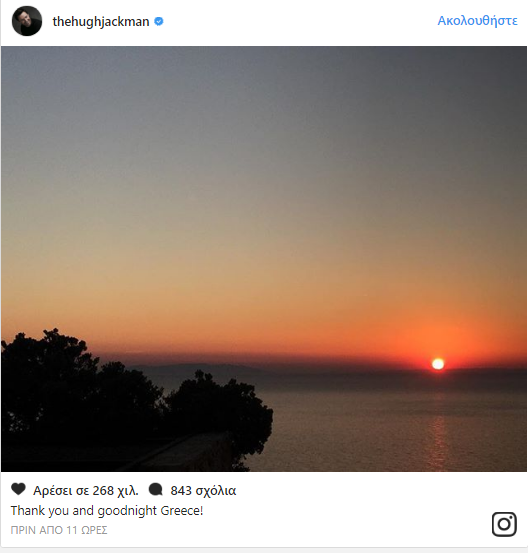Στην Ελλάδα για διακοπές βρίσκεται ο Χιου Τζάκμαν μαζί με τη σύζυγό του και τα παιδιά τους, και δεν σταματά με φωτογραφίες του να διαφημίζει τις ομορφιές του τόπου μας στους εκατομμύρια θαυμαστές του ανά την υφήλιο.