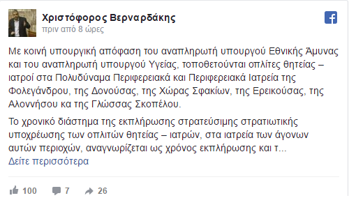 Με κοινή υπουργική απόφαση του αναπληρωτή υπουργού Εθνικής Άμυνας και του αναπληρωτή υπουργού Υγείας, τοποθετούνται οπλίτες θητείας – ιατροί στα Πολυδύναμα Περιφερειακά και Περιφερειακά Ιατρεία της Φολεγάνδρου, της Δονούσας, της Χώρας Σφακίων, της Ερεικούσας, της Αλοννήσου κα της Γλώσσας Σκοπέλου.
