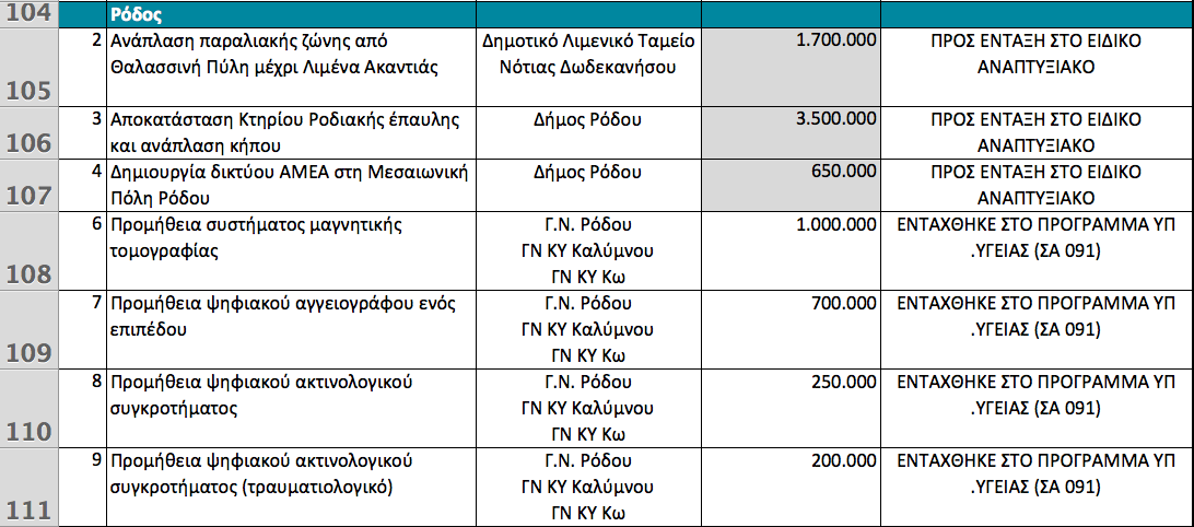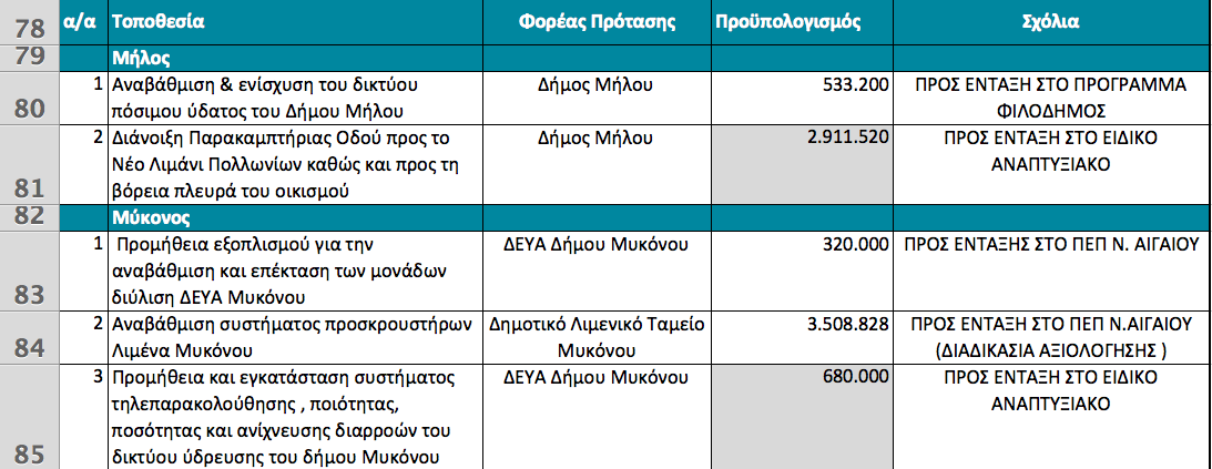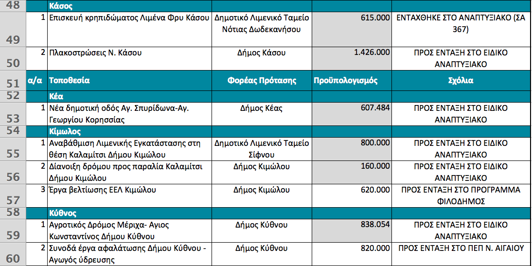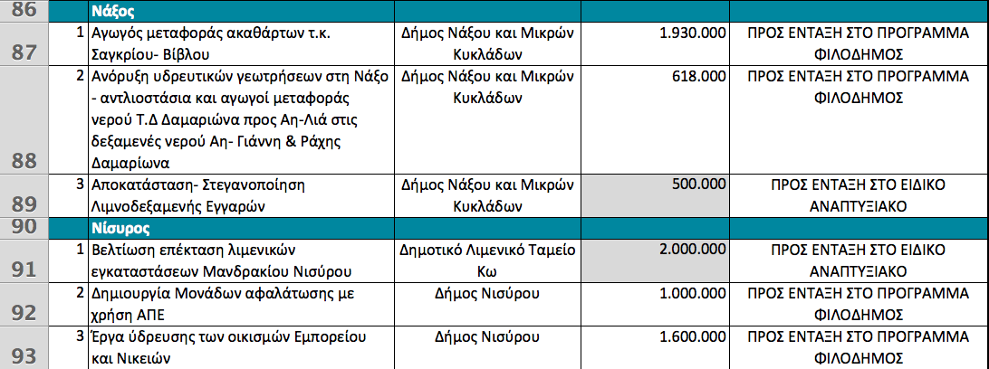 Συνολικά 101 έργα στα νησιά του Αιγαίου ύψους 180 εκατ. ευρώ θα χρηματοδοτηθούν από εθνικούς πόρους μέσω των Ειδικών Αναπτυξιακών και άλλων προγραμμάτων του Υπουργείου. Σε κάθε νησί εντάσσεται τουλάχιστον ένα έργο, ενώ όλα τα έργα αποτελούν προτάσεις των τοπικών φορέων.